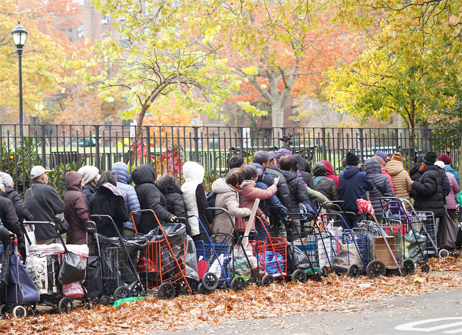 美國紐約一處食物發(fā)放點人們在領(lǐng)取食物